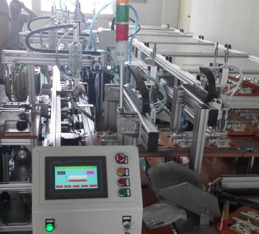TV揚聲器生產(chǎn)線整體采用直線式單工位設(shè)計方式,中間無中斷。磁路部分主輸送采用伺服電機下?lián)懿鏅C構(gòu)裝置,一線部分采用三段下?lián)懿鏅C構(gòu)搭配人工作業(yè)中轉(zhuǎn)輸送帶設(shè)計方式。